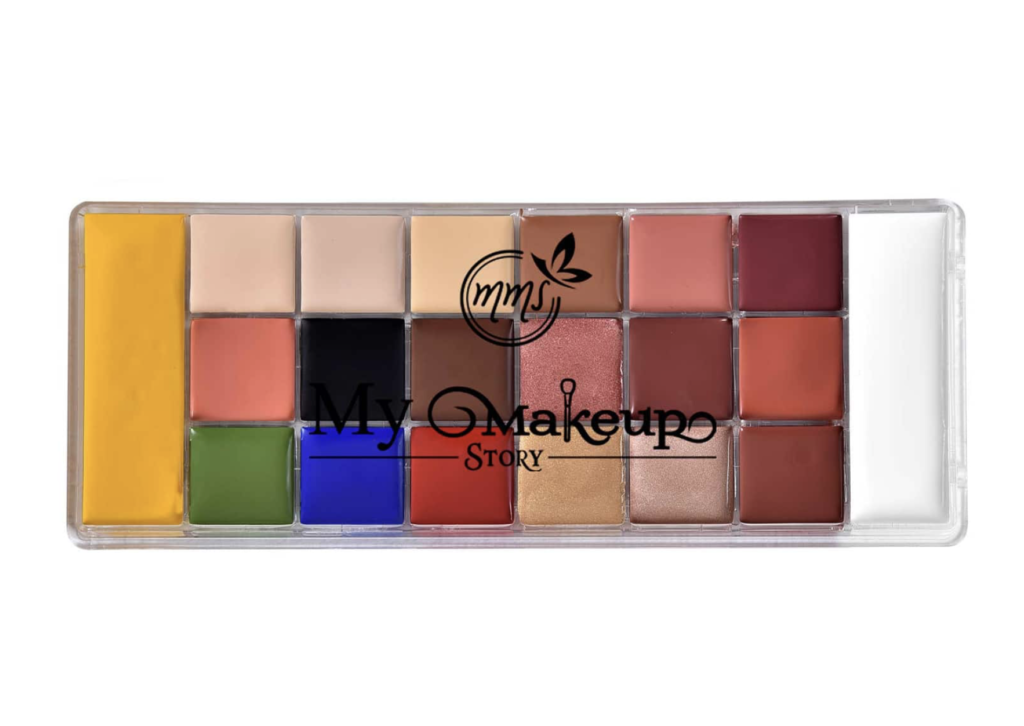 پالت جادویی مای میکاپ استوری یک پالت 20 رنگ با بافت کرمی و روغنی است که برای بدن و صورت، چشم و لبها قابل استفاده میباشد. قابلیت ترکیب رنگ دارد و یک پالت کامل و مناسب برای استفاده میکاپ آرتیستها و حتی استفاده شخصی است. پالت مای میکاپ دارای رنگهایی متنوع با رنگدانه و پیگمنت بالا است که از رنگهای کرم، قهوهای و نود برای کانتور، هایلایت صورت، سایه چشم و حتی رژ لب میتوان استفاده کرد؛ همچنین به عنوان زیر ساز سایه برای داشتن سایه چشمی با پیگمنت بالاتر نیز کاربرد دارد. از رنگهای شاین دار این پالت برای پشت پلک و به عنوان هایلایتر و از رنگهای قرمز، قهوه ای،بنفش و نارنجی برای رژ لب میتوان استفاده کرد. این پالت شما را برای انواع آرایشهای روزانه و مهمانی بی نیاز کرده و میکاپی زیبا و در عین حال طبیعی برایتان به ارمغان میآورد.